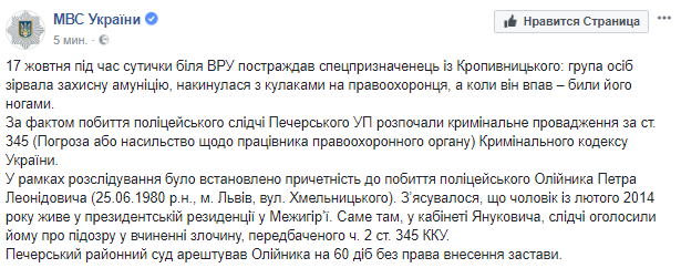Напомним, что 17 октября во время стычек у парламента пострадал спецназовец из Кропивницкого. Группа лиц сорвала с него защитную амуницию, набросилась с кулаками, а когда он упал - били его ногами.