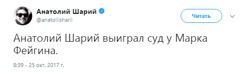 Блогер Анатолий Шарий выиграл суд у российского адвоката Марка Фейгина в деле о защите репутации. Об этом сам Шарий сообщил в Twitter.