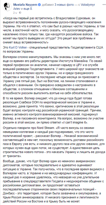 Спецпредставитель США по вопросам Украины Курт Волкер заявил, что об участии россиян в миротворческой миссии на Донбассе не может быть и речи. Об этом сообщает нардеп от БПП Мустафа Найем на своей странице в Facebook.
