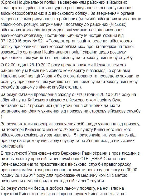 "В 02:00 часов 28.10.2017 года представителями Шевченковского районного военного комиссариата во взаимодействии с органами Национальной полиции Украины было организовано и проведено мероприятия по розыску призывников, уклоняющихся от призыва на срочную военную службу (в одном из ночных клубов столицы) По результатам проведения мероприятия в 04:00 часов 28.10.2017 года на сборный пункт Киевского городского военного комиссариата было доставлено 32 призывника для уточнения учетных данных и установления факта уклонения от призыва на срочную военную службу. По результатам проверки указанных лиц, в отношении уклонения от призыва на территории Киевского городского сборного пункта Киевского городского военного комиссариата остались 15 призывников, которые уклонялись от призыва на срочную военную службу и не являлись в военные комиссариаты", - говорится в сообщении.