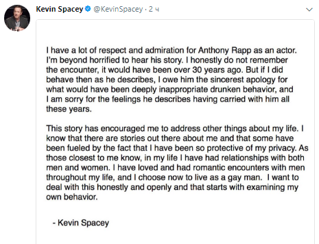 Известный американский актер Кевин Спейси, обладатель "Оскара", после обвинений в домогательстве признался, что у него были отношения с мужчинами. По крайней мере такая запись появилась в официальном аккаунте актера в Twitter.