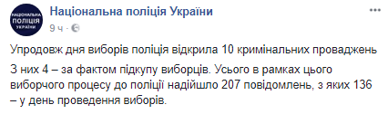 Правоохранители открыли десять уголовных производств по факту нарушений и инцидентов на местных выборах. Об этом сообщает пресс-служба Нацполиции в Facebook.