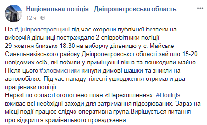 "29 октября около 18:30 на избирательный участок в с. Майское зашло 15-20 неизвестных лиц, которые выбили в помещении окна и повредили имущество. После этого злоумышленники бросили дымовые шашки и скрылись на автомобилях. Во время нападения телесные повреждения получили двое полицейских, которые дежурили на участке", - заявили в полиции.