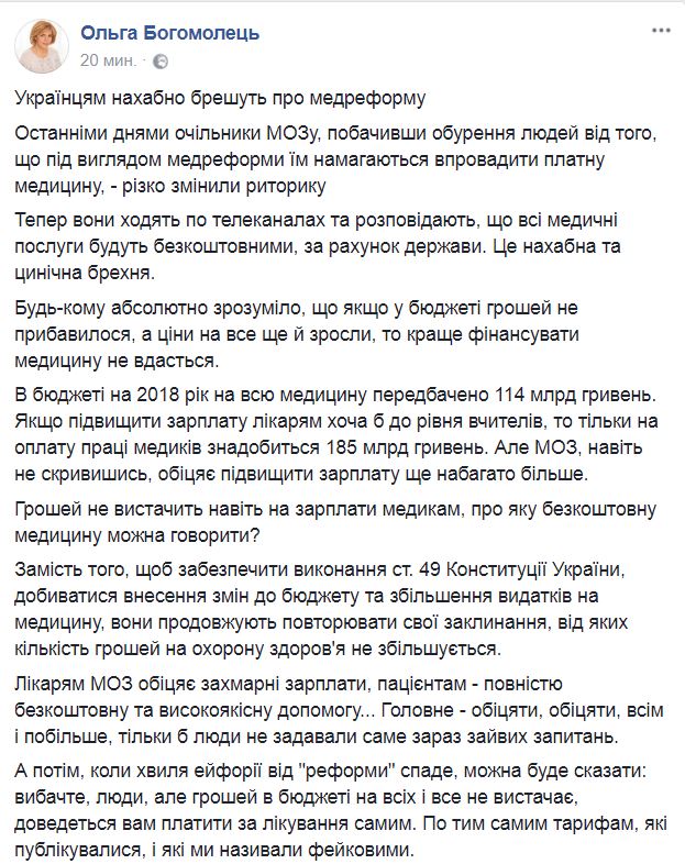 "В последние дни руководители МОЗ, увидев возмущение людей от того, что под видом медреформы им пытаются внедрить платную медицину, - резко изменили риторику. Теперь они ходят по телеканалам и рассказывают, что все медицинские услуги будут бесплатными, за счет государства. Это наглая и циничная ложь. Любому совершенно ясно, что если в бюджете денег не прибавилось, а цены на все еще и выросли, то лучше финансировать медицину не удастся", - пишет Богомолец.