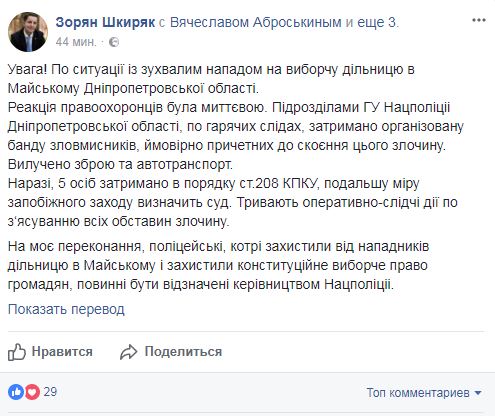 "Реакция правоохранителей была мгновенной. Подразделениями ГУ Нацполиции Днепропетровской области, по горячим следам, задержали организованную банду злоумышленников, вероятно причастных к совершению этого преступления. Изъято оружие и автотранспорт. Сейчас 5 человек задержаны в порядке ст.208 УПКУ, дальнейшую меру пресечения определит суд. Продолжаются оперативно-следственные действия по выяснению всех обстоятельств преступления", -написал Шкиряк.