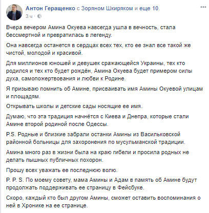 Геращенко также сообщил, что по его совету мама Окуевой и ее муж Адам Осмаев в память об Амине будут продолжать поддерживать ее страницу в Facebook.