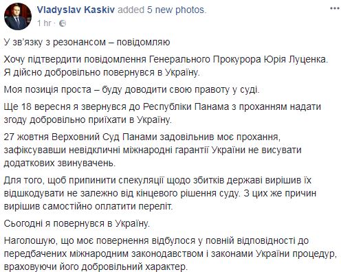 "Хочу подтвердить сообщение Генерального Прокурора Юрия Луценко. Я действительно добровольно вернулся в Украину", - написал Каськив.