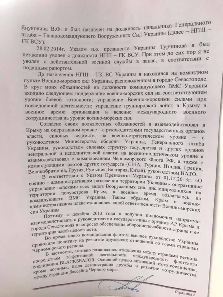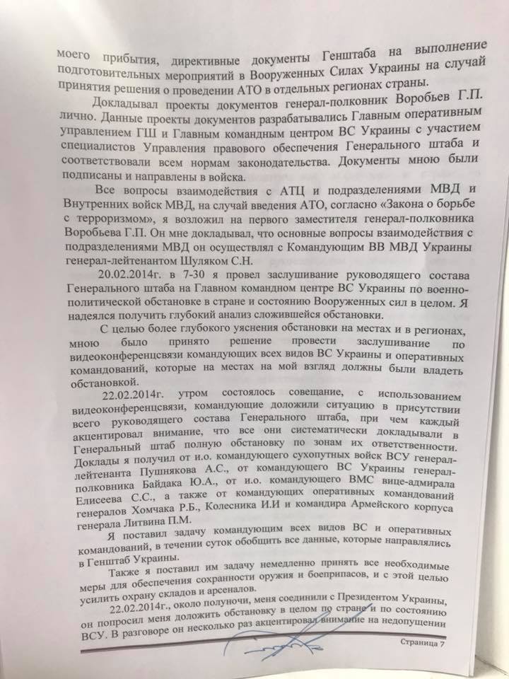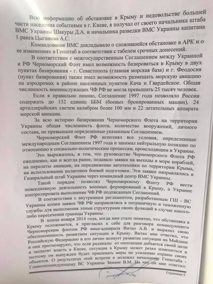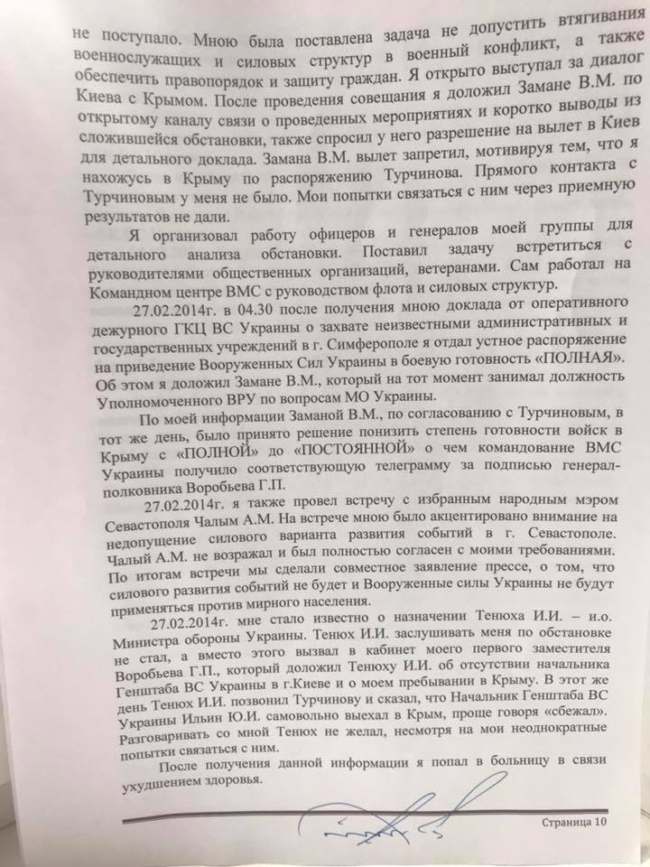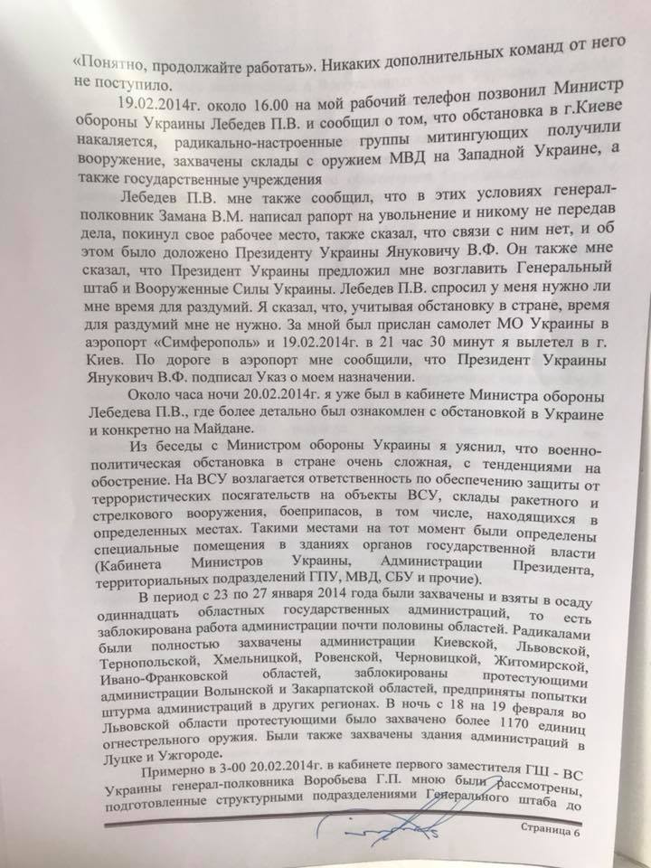 "27.02.2014 в 04.30 после получения мною доклада от оперативного дежурного ГКЦ ВС Украины о захвате неизвестными административных и государственных учреждений в г. Симферополе я отдал устное распоряжение на приведение Вооруженных Сил Украины в боевую готовность "ПОЛНАЯ". Об этом я доложил Замане В.М., который на тот момент занимал должность Уполномоченного ВРУ по вопросам МО Украины", - говорится в показаниях экс-главы Генштаба. Далее он утверждает: "По моей информации Заманой В.М., по согласованию с Турчиновым, в тот же день, было принято решение понизить степень готовности войск в Крыму с "ПОЛНОЙ" до "ПОСТОЯННОЙ" о чем командование ВМС Украины получило соответствующую телеграмму за подписью генерал-полковника Воробьева Г.П.".