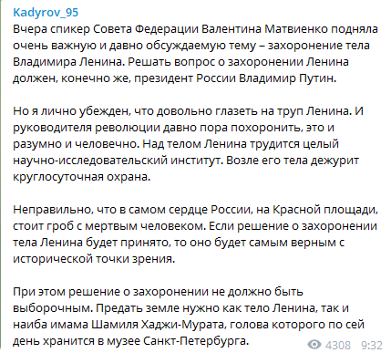 "Я лично убежден, что довольно глазеть на труп Ленина. И руководителя революции давно пора похоронить, это и разумно, и человечно", - написал Кадыров.