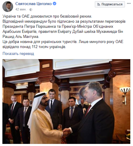 "Это хорошая новость для украинских туристов. Только в прошлом году ОАЭ посетили более 112 000 украинцев", написал Цеголко.