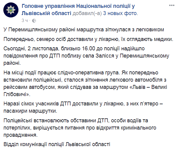 В четверг, 2 ноября около 16:00 у села Залесье Перемышлянского района Львовской области произошло ДТП. В результате столкновения легковушки с рейсовым автобусом госпитализация потребовалась семерым людям.