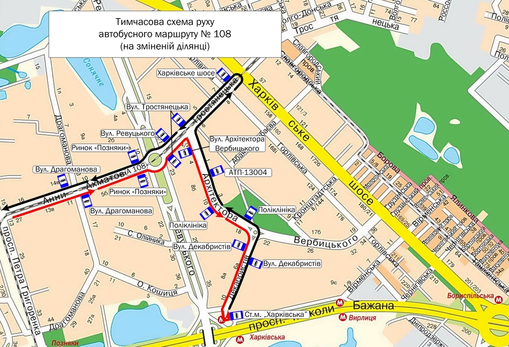 В частности, движение автобусов маршрута №108 в направлении ст. м. "Левобережная" организовано по трассе: ст. м. "Харьковская" - ул. Декабристов - ул. Архитектора Вербицкого - ул. Тростянецкая (до Харьковского шоссе) - ул. Тростянецкая - ул. А. Ахматовой - дальше по постоянному маршруту.