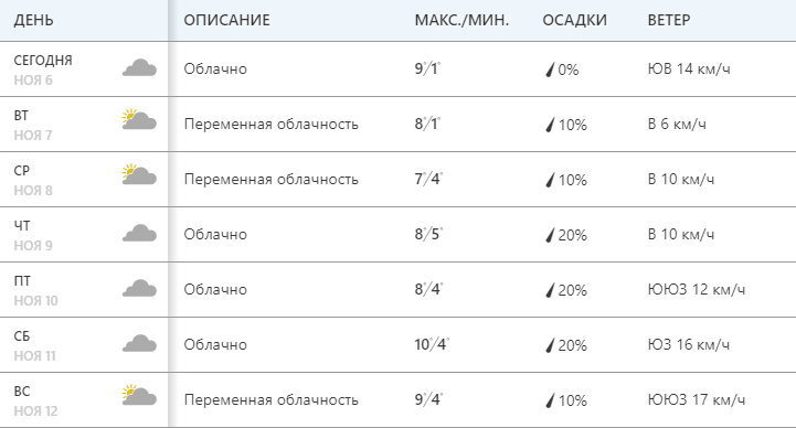 Сайт Weather.com обещает преимущественно облачную погоду всю неделю. При этом осадков не ожидается. Днем +7...+10.
