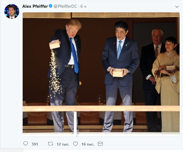 На второй день визита в Японию у Трампа и премьер-министра Синдзо Абэ была запланирована аудиенция у императорской четы Акихито и Митико. Как и других иностранных политиков, его провели к пруду, где живут карпы кои - декоративные одомашненные рыбы.