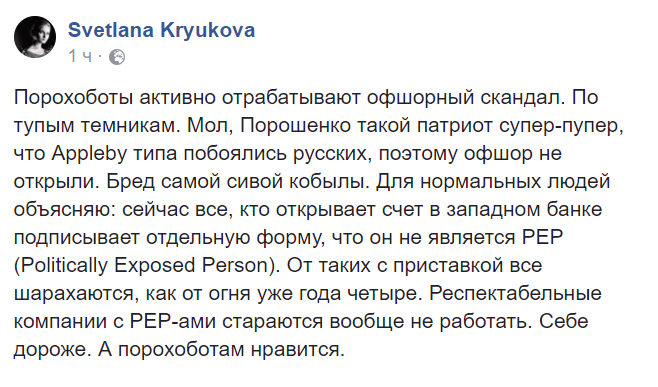 "Порохоботы активно отрабатывают офшорный скандал. По тупым темникам. Мол, Порошенко такой патриот супер-пупер, что Appleby типа побоялись русских, поэтому офшор не открыли. Бред самой сивой кобылы. Для нормальных людей объясняю: сейчас все, кто открывает счет в западном банке подписывает отдельную форму, что он не является PEP (Politically Exposed Person). От таких с приставкой все шарахаются, как от огня уже года четыре. Респектабельные компании с PEP-ами стараются вообще не работать. Себе дороже. А порохоботам нравится", - пишет в Facebook заместитель главного редактора "Страны" Светлана Крюкова.