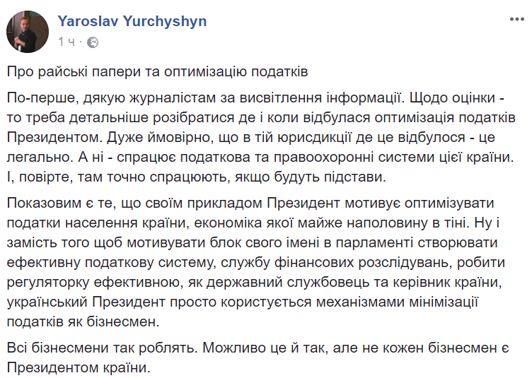 "Показательно, что своим примером президент мотивирует оптимизировать налоги населения страны, экономика которой почти наполовину в тени. Ну и вместо того чтобы мотивировать блок своего имени в парламенте создавать эффективную налоговую систему, службу финансовых расследований, делать регуляторку эффективной как государственный служащий и руководитель страны,