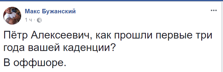 На этом шутки не закончились. Блогер Макс Бужанский придумал анекдот об офшорах Порошенко: