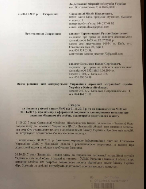 Адвокаты лидера политической партии "Рух нових сил" Михаила Саакашвили подали жалобу в миграционную службу Украины в связи с отказом ведомства предоставить дополнительную защиту. Об этом в Facebook адвокат Павел Богомазов.