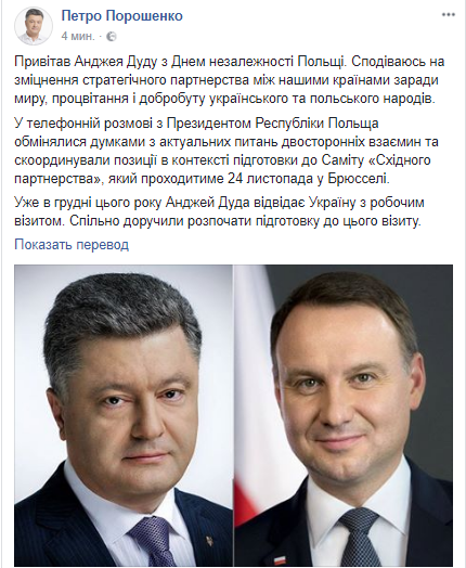 В субботу, 11 ноября, Петр Порошенко поздравил Анджея Дуду с днем независимости Польши и заявил, что в декабре состоится его визит в Украину. Об этом говорится на станице Facebook украинского президента.