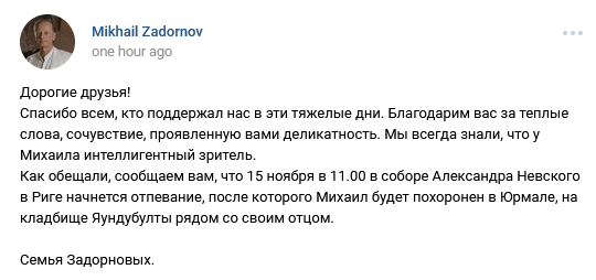 "Спасибо всем, кто поддержал нас в эти тяжелые дни. Благодарим вас за теплые слова, сочувствие, проявленную вами деликатность. Мы всегда знали, что у Михаила интеллигентный зритель", - говорится в сообщении семьи.