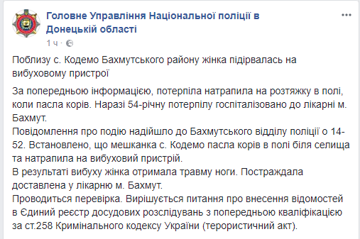 Возле Бахмута в Донецкой области женщина пасла коров в поле и взорвалась на мине. В результате она получила травму ноги, сообщает пресс-служба донецкой полиции в Facebook.