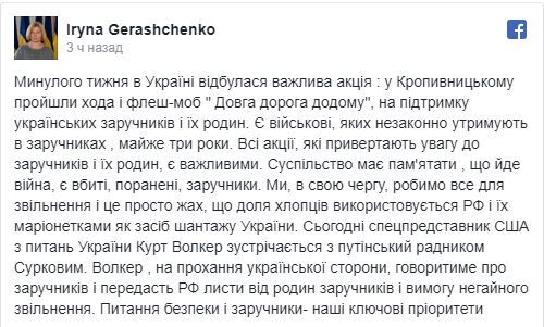 "Вопросы безопасности и заложники - наши ключевые приоритеты", - подчеркнула Геращенко.