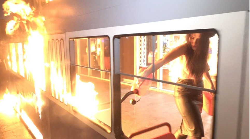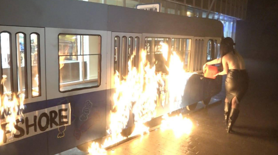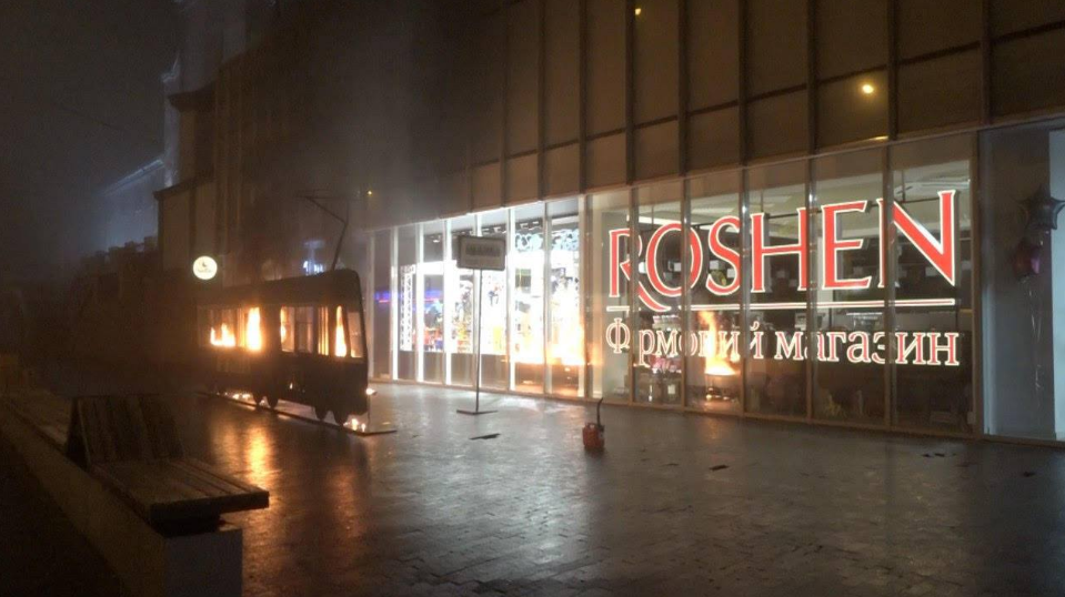 В Виннице, возле главного магазина Roshen активистка Femen сожгла декоративный трамвайный вагон. Об этом сообщается на странице организации в Facebook.