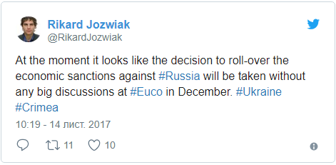 "На данный момент похоже, что решение о продлении экономических санкций против России будет принято без каких-либо серьезных обсуждений на заседании Европейского совета в декабре", - написал журналист.