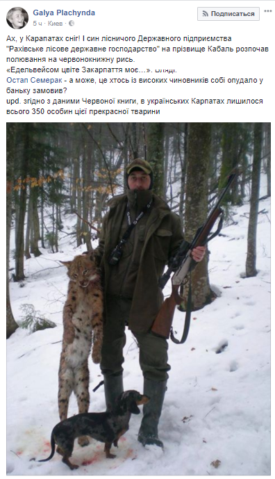 "Сын лесничего Государственного предприятия "Раховское лесное государственное хозяйство" по фамилии Кабаль начал охоту на краснокнижную рысь", - говорится в ее сообщении. При этом, согласно данным Красной книги, в украинских Карпатах осталось всего 350 особей этого животного.