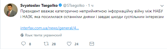 Президент Украины Петр Порошенко считает неприемлемым конфликт между Национальным антикоррупционным бюро Украины (НАБУ) и Национальным агентством по вопросам предотвращения коррупции (НАПК). Об этом сообщил пресс-секретарь президента Святослав Цеголко в своем Twitter.