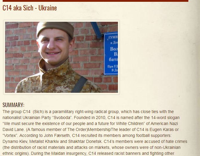 Лидер C14 - Евгений Карась или "Вортекс". C14 вербовала своих членов среди футбольных болельщиков: "Динамо" Киев, "Металлист" Харьков и "Шахтер" Донецк.
