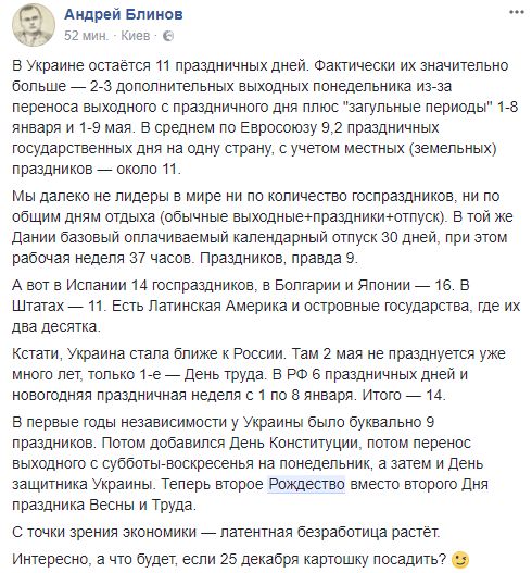 В первые годы независимости у Украины было буквально 9 праздников. Потом добавился День Конституции, потом перенос выходного с субботы-воскресенья на понедельник, а затем и День защитника Украины. Теперь второе Рождество вместо второго Дня праздника Весны и Труда. С точки зрения экономики — латентная безработица растет".
