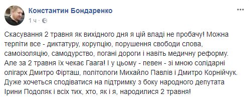 Политолог Константин Бондаренко в шутку возмущается: "Отмену 2 мая как выходного дня я этой власти не прощу! Можно терпеть все - диктатуру, коррупцию, нарушение свободы слова, самоизоляцию, самодурство, плохие дороги и даже медицинскую реформу. Но за 2 мая их ждет Гаага! И в этом - уверен - со мной солидарны олигарх Дмитрий Фирташ, политологи Михаил Павлов и Дмитрий Корнейчук. Очень хочется надеяться на поддержку со стороны народного депутата Ирины Подоляк и всех тех, кто, как и я, родились 2 мая!"