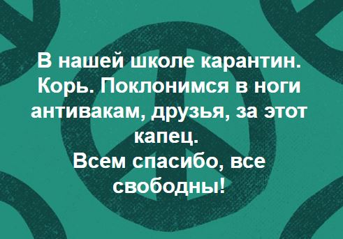 "В нашей школе карантин. Корь. Поклонимся в ноги антивакам, друзья, за этот капец. Всем спасибо, все свободны!", - написала она.