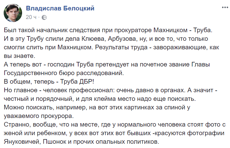 "Странно, вообще, что на месте, где у нормального человека стоят фото с женой или ребенком, у всех вот этих вот бывших - красуются фотографии Януковичей, Пшонок и прочих опальных политиков", - написал Белоцкий в Facebook. Также он сказал, что именно во время пребывания Трубы в Генпрокуратуре были "слиты" дела Клюева, Арбузова и других.