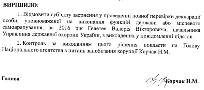 НАПК отказало на запрос "Центра противодействию коррупции" в проверке электронной декларации за 2016 год руководителя Управления государственной охраны Валерия Гелетея. Об этом сообщает сайт "Центра противодействия коррупции".