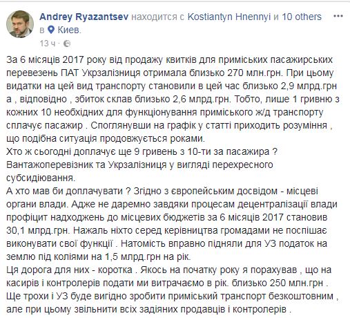 "За 6 месяцев 2017 от продажи билетов для пригородных пассажирских перевозок ПАО Укрзализныця получила около 270 млн грн. При этом расходы на этот вид транспорта составляли в это время около 2,9 млрд, а, соответственно, ущерб составил около 2,6 млрд. То есть, только 1 гривну с каждых 10 необходимых для функционирования пригородного ж/д транспорта платит пассажир. Взглянув на график в статье приходит понимание, что подобная ситуация продолжается годами", - отметил Рязанцев на своей странице в Facebook, передает ЦТС.