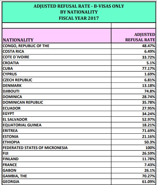 Больше всего США отказывают в визах жителям Федерального штатов Микронезии и Западной Сахары (доля отказов - 100%), а также Республики Палау (83,33%), Кубы (77,17%), Бурунди (75,55%), Буркина -Фасо (75,74%), Сомали (75,5%), Афганистана (72,14%), Эритрее (71,69%), Гаити (71,44%), Гамбии (70,27%).