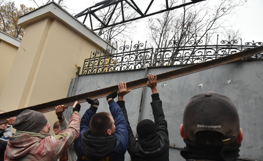 Позже митингующие забрали железную дверь, сорванную со входа в летний театр и понесли ее к зданию мэрии. Путь занял около километра.