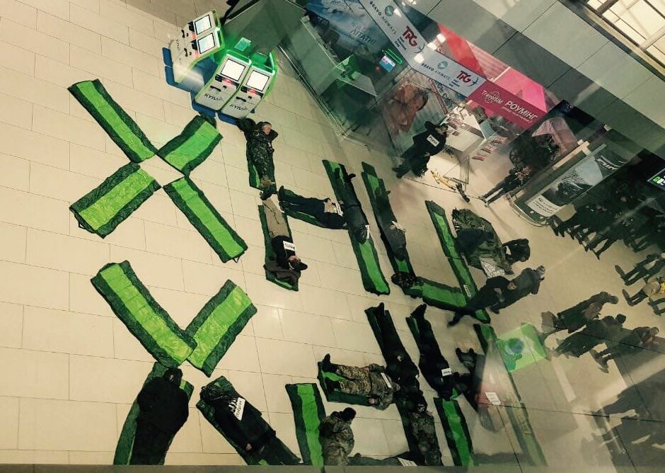 "Активисты партии "Рух новых сил" Михаила Саакашвили" и неравнодушные киевляне пикетировали аэропорт "Киев" в Жулянах, где незаконно удерживают и хотят депортировать похищенных вчера соратников Саакашвили - ветеранов АТО и журналиста. Они устроили в их поддержку флэш-моб - выложили из спальников "ПРХ ПНХ" и не сойдут с места пока их не освободят", - заявили в пресс-службе партии РНС.
