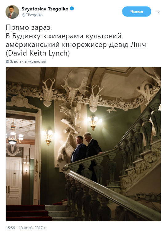 "Прямо сейчас. В Доме с химерами культовый американский кинорежиссер Дэвид Линч", - написал он в твиттере.