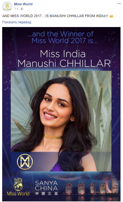 Жительница Индии Мануши Чхиллар стала обладательницей титула "Мисс Мира - 2017". Об этом сообщает пресс-служба конкурса в Facebook.