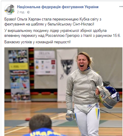 "Браво! Ольга Харлан стала победительницей Кубка мира по фехтованию на саблях в бельгийском Синт-Никлас! В решающем поединке лидер украинской сборной одержала уверенную победу над Росселлой Грегорио из Италии со счетом 15 - 6. Желаем успехов в командном первенстве", - говорится в сообщении Федерации фехтования.