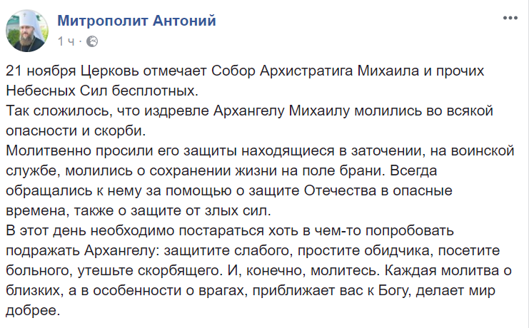 В этот день необходимо постараться хоть в чем-то попробовать подражать Архангелу: защитите слабого, простите обидчика, посетите больного, утешьте скорбящего. И, конечно, молитесь. Каждая молитва о близких, а в особенности о врагах, приближает вас к Богу, делает мир добрее", - написал у себя в Facebook митрополит Антоний, управделами УПЦ.