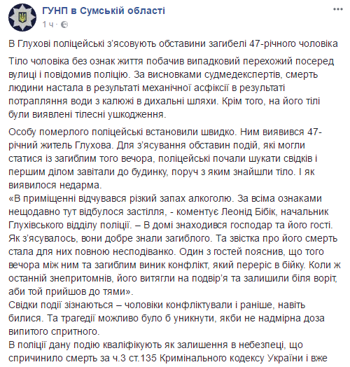 "В помещении ощущался резкий запах алкоголя. По всем признакам недавно здесь произошло застолье. В доме находился хозяин и его гости. Как выяснилось, они хорошо знали погибшего. И весть о его смерти стала для них полной неожиданностью. Один из гостей объяснил, что в тот вечер между ним и погибшим возник конфликт, который перерос в драку. Когда же последний потерял сознание, его вытащили на улицу и оставили у ворот, чтобы тот пришел к себе", – сообщил начальник Глуховского отдела полиции Леонид Бибик.