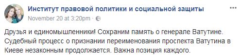 Институт правовой политики и социальной защиты призывает украинцев сохранить память о генерале Ватутине, проголосовав на сайте Prospekt.kiev.ua за отмену переименования проспекта в Киеве.