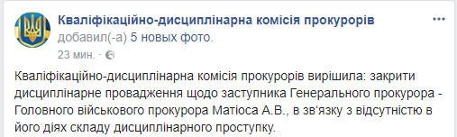 "Квалификационно-дисциплинарная комиссия прокуроров решила закрыть дисциплинарное производство в отношении заместителя Генерального прокурора - Главного военного прокурора Матиос А.В., в связи с отсутствием в его действиях состава дисциплинарного проступка", - говорится в сообщении.