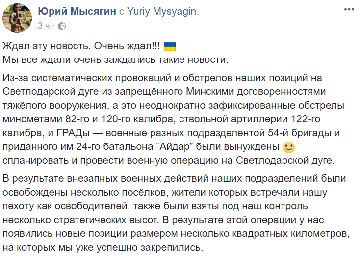 "Из-за систематических провокаций и обстрелов наших позиций на Светлодарской дуге из запрещённого Минскими договоренностями тяжёлого вооружения, а это неоднократно зафиксированные обстрелы минометами 82-го и 120-го калибра, ствольной артиллерии 122-го калибра, и ГРАДы — военные разных подразделентой 54-й бригады и приданного им 24-го батальона “Айдар” были вынуждены спланировать и провести военную операцию на Светлодарской дуге.