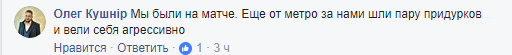 В комментариях к его посту Олег Кушнир написал, что они тоже были на этом матче и "еще от метро за нами шли пару придурков и вели себя агрессивно".