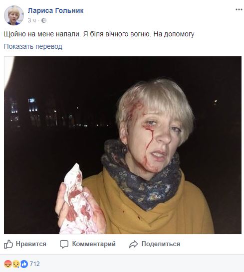 "Только что на меня напали. Я у Вечного огня. На помощь", - сообщила она. В заметке Гольник разместила фото, на котором видно, что у нее разбита голова.